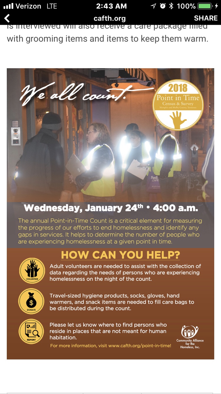 The Community Alliance for the Homeless will be doing a Point Count to count the number of homeless on Wednesday Jan. 24. They are asking for volunteers to go out and count, but also to help provide basic needs such as gloves, socks, travel sized hygiene products, and a number of other things.